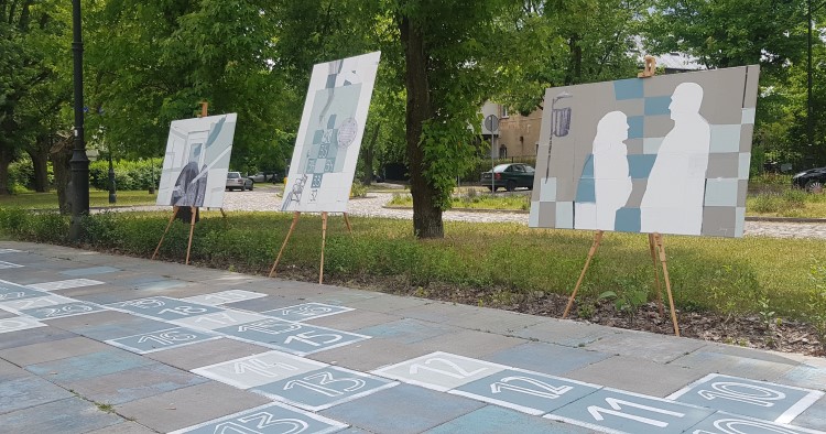 Trzy obrazy Katarzyny Derkacz-Grajewskiej w tle i chodnik w kształcie „ryby”…