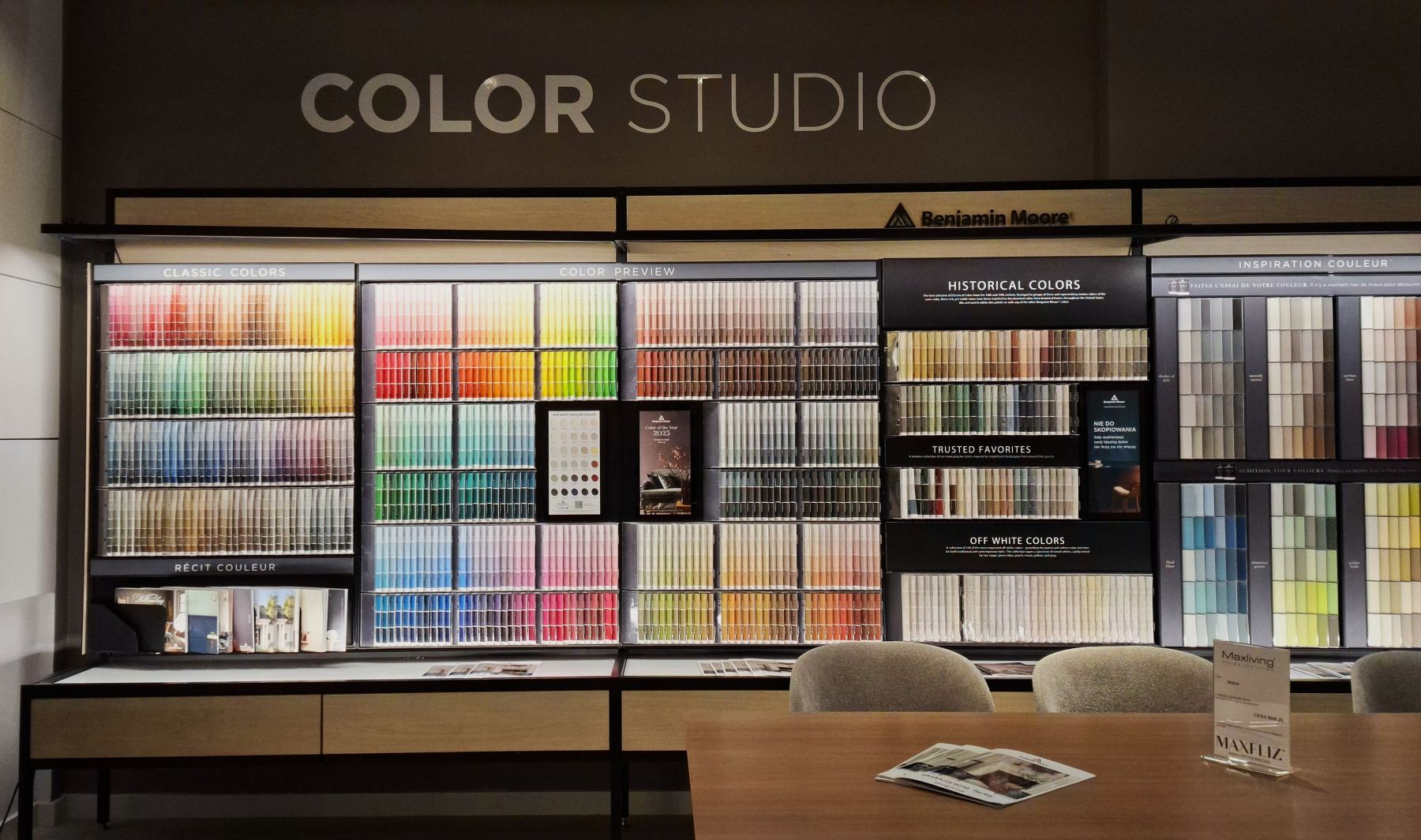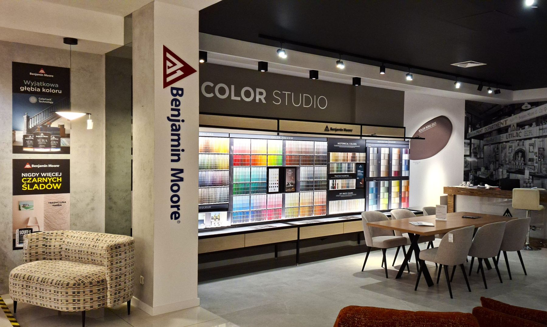 „Pracownikom MAXFLIZ często zadawano pytanie o farby segmentu premium. W odpowiedzi, odwiedzający showroom otrzymali dokładnie to, czego oczekiwali. Wszystkich wita słynna Betty Moore, a na dwóch ścianach wyeksponowaliśmy historyczne zdjęcie wnętrza jednego z amerykańskich sklepów Benjamin Moore” – podkreśla Artur Nowak, Dyrektor operacyjny Benjamin Moore Polska.