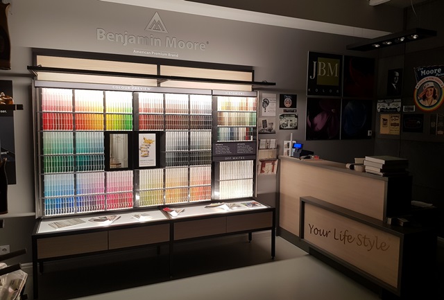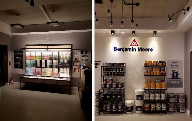 W strefie marki Benjamin Moore pojawił się elegancki, podświetlany ekspozytor z chipsami kolorów z najpopularniejszych palet.