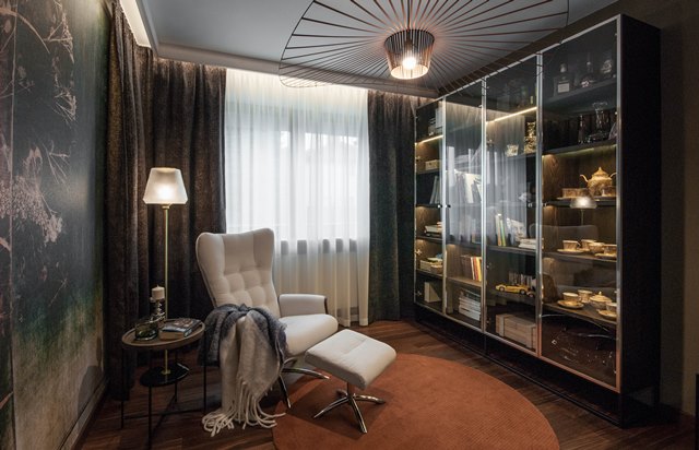 Kolorystyka w gabinecie jest nieco inna niż w pozostałej części domu, a miało to na celu wyróżnienie tego wnętrza i przełamanie zasady jasnych, łagodnych pomieszczeń.