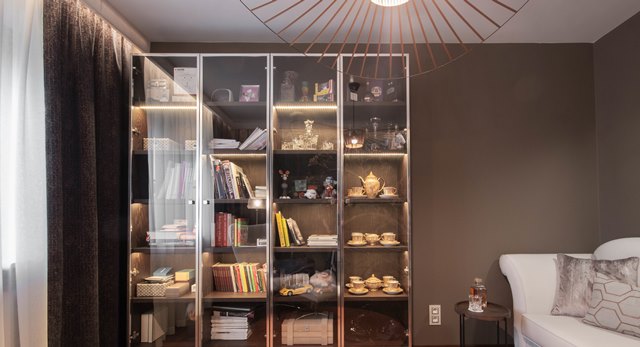 Wchodząc do gabinetu widzimy duży, okazały regał szklany zaprojektowany według koncepcji Viva Design.