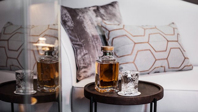 Dla pozostałych ścian wybrano satynowy fornir. Aranżację uzupełnia lakierowana deska podłogowa, stanowiąca idealne tło dla eleganckich dodatków.