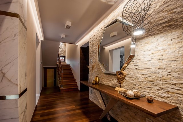 Ścianę przy konsoli wypełnia naturalny kamień w jasnej tonacji. Stworzono dekoracyjny łuk nad wnęką, która prowadzi do gabinetu i łazienki, wykończony połyskliwymi płytkami.