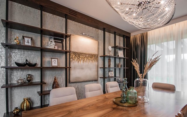Salon jest otwarty na jadalnię. Dominantę we wnętrzu stanowi duży prostokątny stół na metalowej nodze, którego blat wykonano z litego drewna.