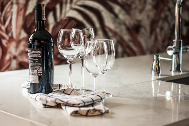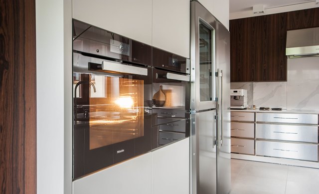 W centrum kuchni znajduje się wyspa, którą dla utrzymania spójności, wykonano również z marmuru oraz niewielki kwadratowy, fornirowany stół - idealne miejsce na wypicie porannej kawy.