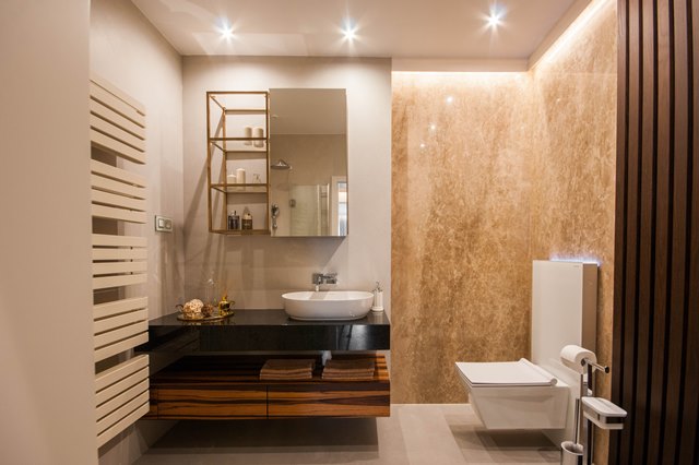 Warto także zwrócić uwagę na piękną szafkę z lustrzanym frontem i lekkimi, szklanymi półeczkami, wiszącą się nad umywalką. Uzupełnieniem tej kompozycji jest naturalny granit w kolorze cappuccino na jednej ze ścian.