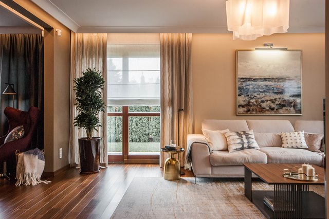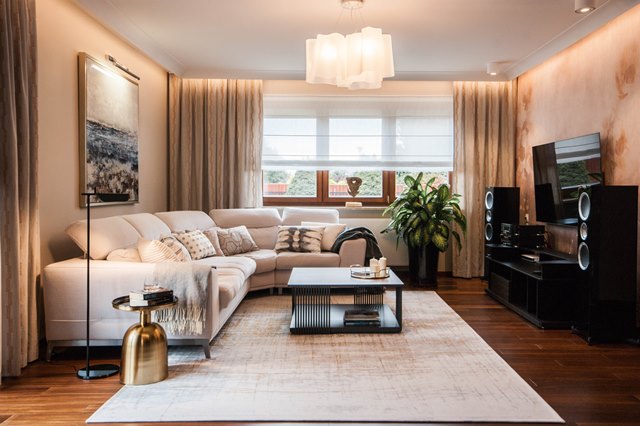 Bursztynową podłogę tworzy deska (sucupira bengalska), którą wyściela belgijski dywan w beżowej kolorystyce.