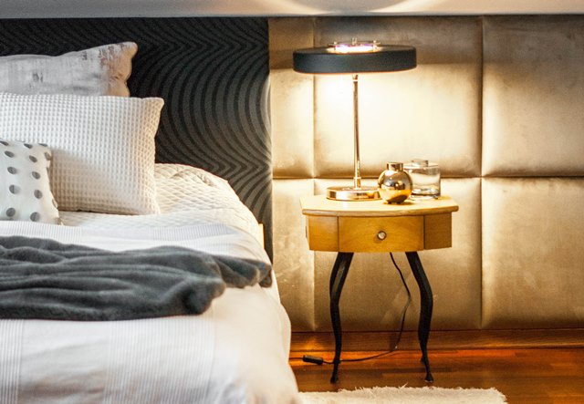 Obok znajdują się dwa stoliki nocne z okazałymi czarnymi lampami. Za łóżkiem zaprojektowano tapicerowany zagłówek w kolorze chłodnej szarości, który jest doskonałym tłem dla łóżka i reszty mebli.