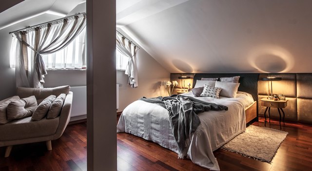Obok łóżka ustawiono dwa fotele z tapicerką w kolorze ciepłym, kremowym i drewnianych nóżkach. Na ścianie przeciwległej do łóżka, za drzwiami z ciemnego dymionego szkła znajduje się szafa garderobiana.