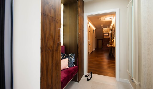 Spacer po rezydencji rozpoczynamy od niewielkiego wiatrołapu z zabudową meblową wykonaną według pomysłu Viva Design. W projekcie zastosowano bardzo nietypowe forniry. We wnękę zabudowy wkomponowano tapicerowane, welurowe siedzisko, za którym znalazł się naturalny kamień Onyx.