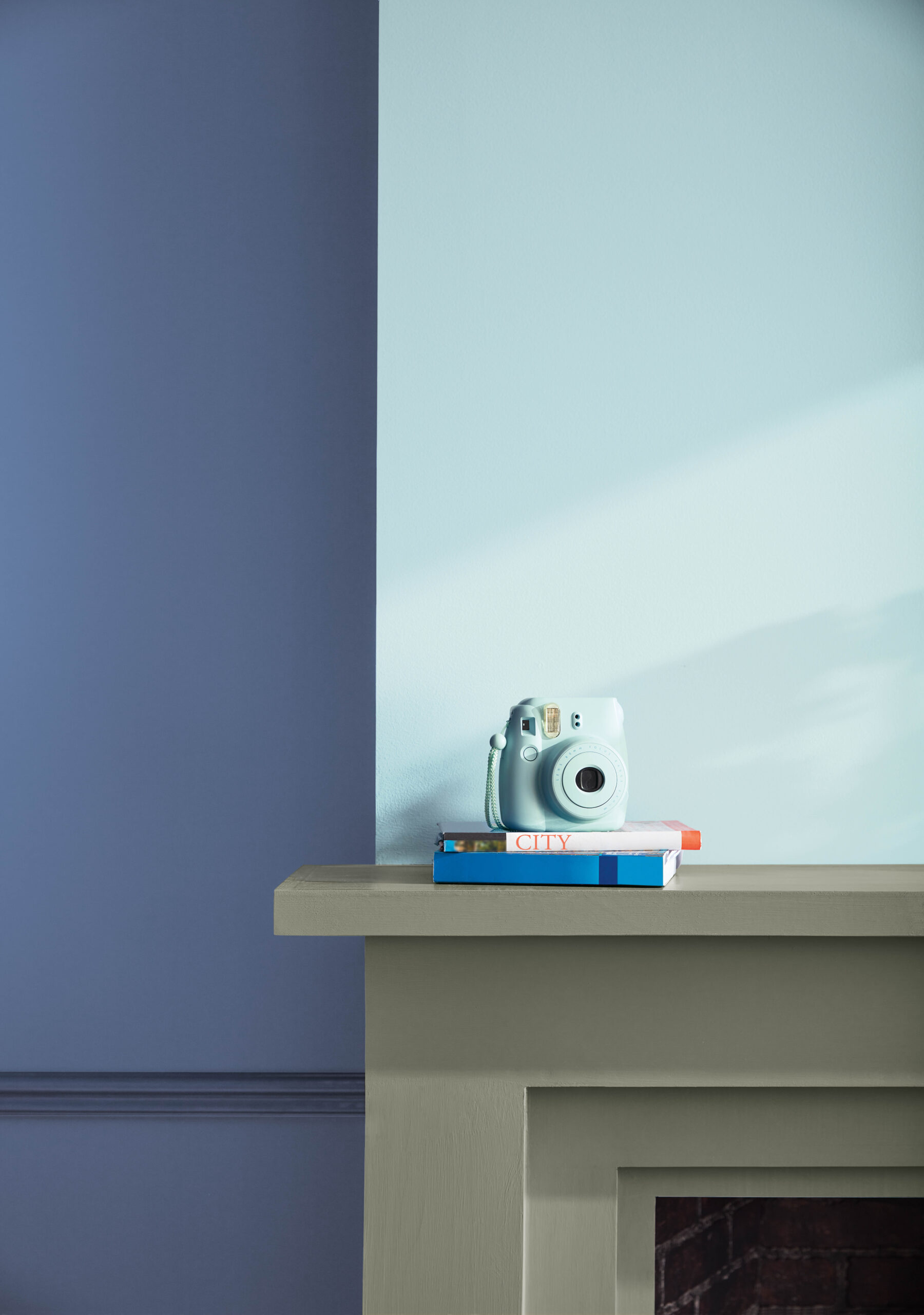 In another example, Blue Nova 825 acts as an anchor with White Dove OC-17 on the upper section, divided by a shelf painted in Topaz 070.
