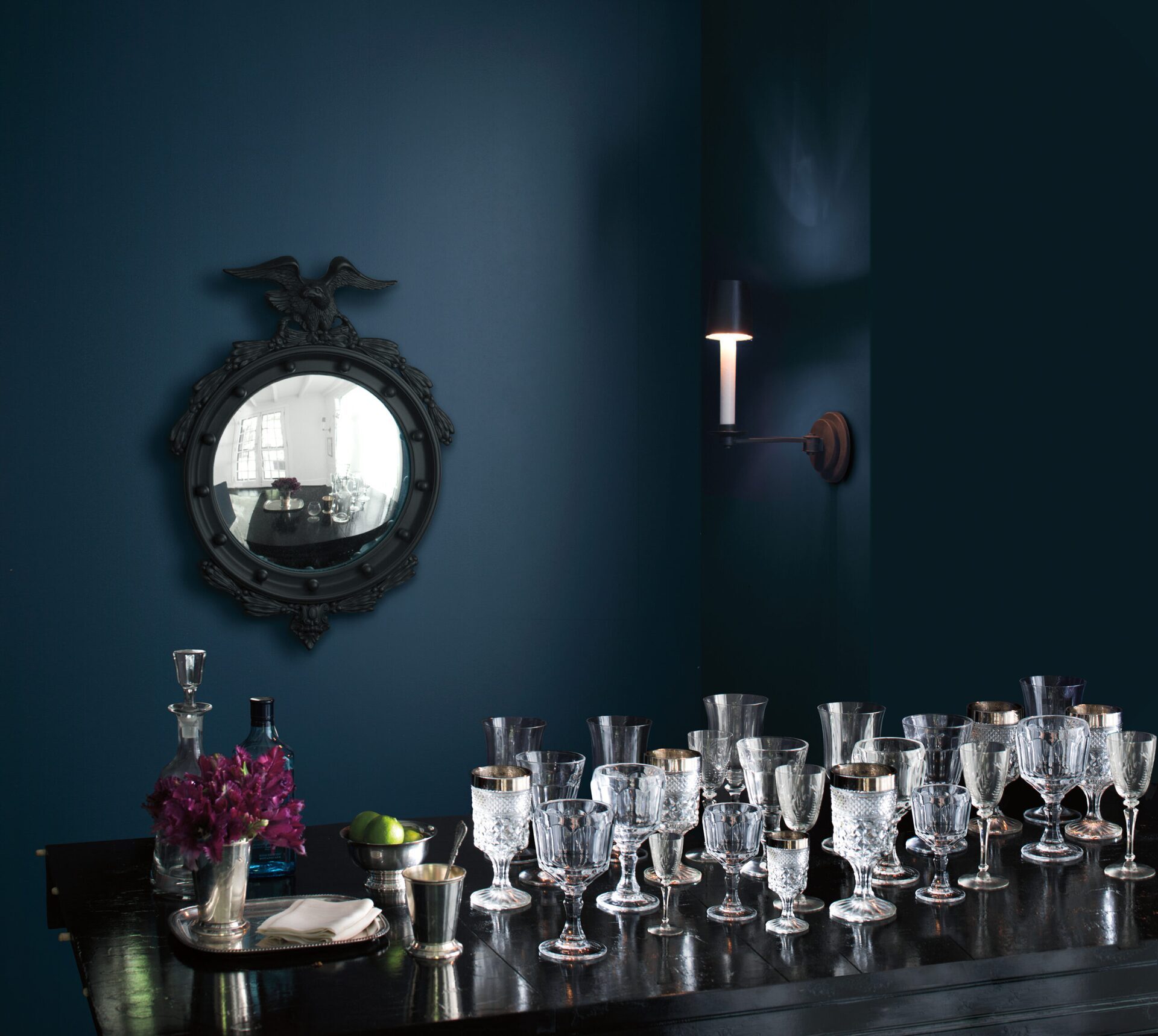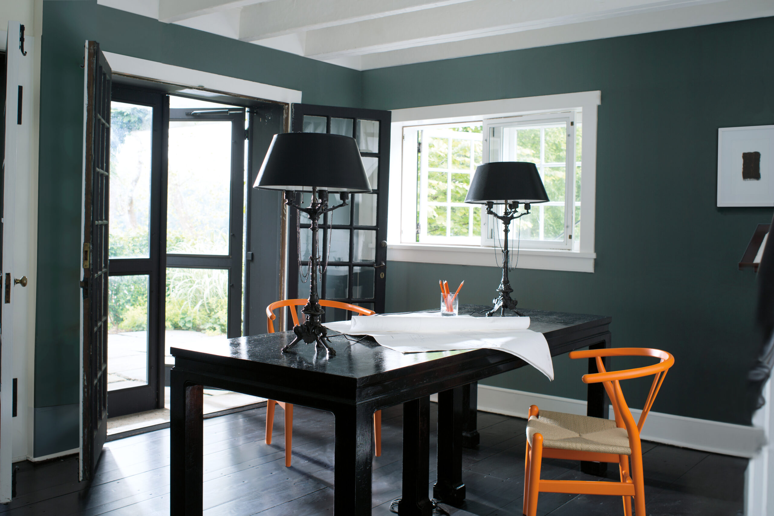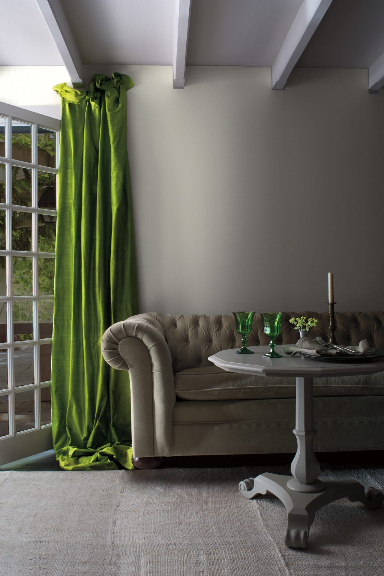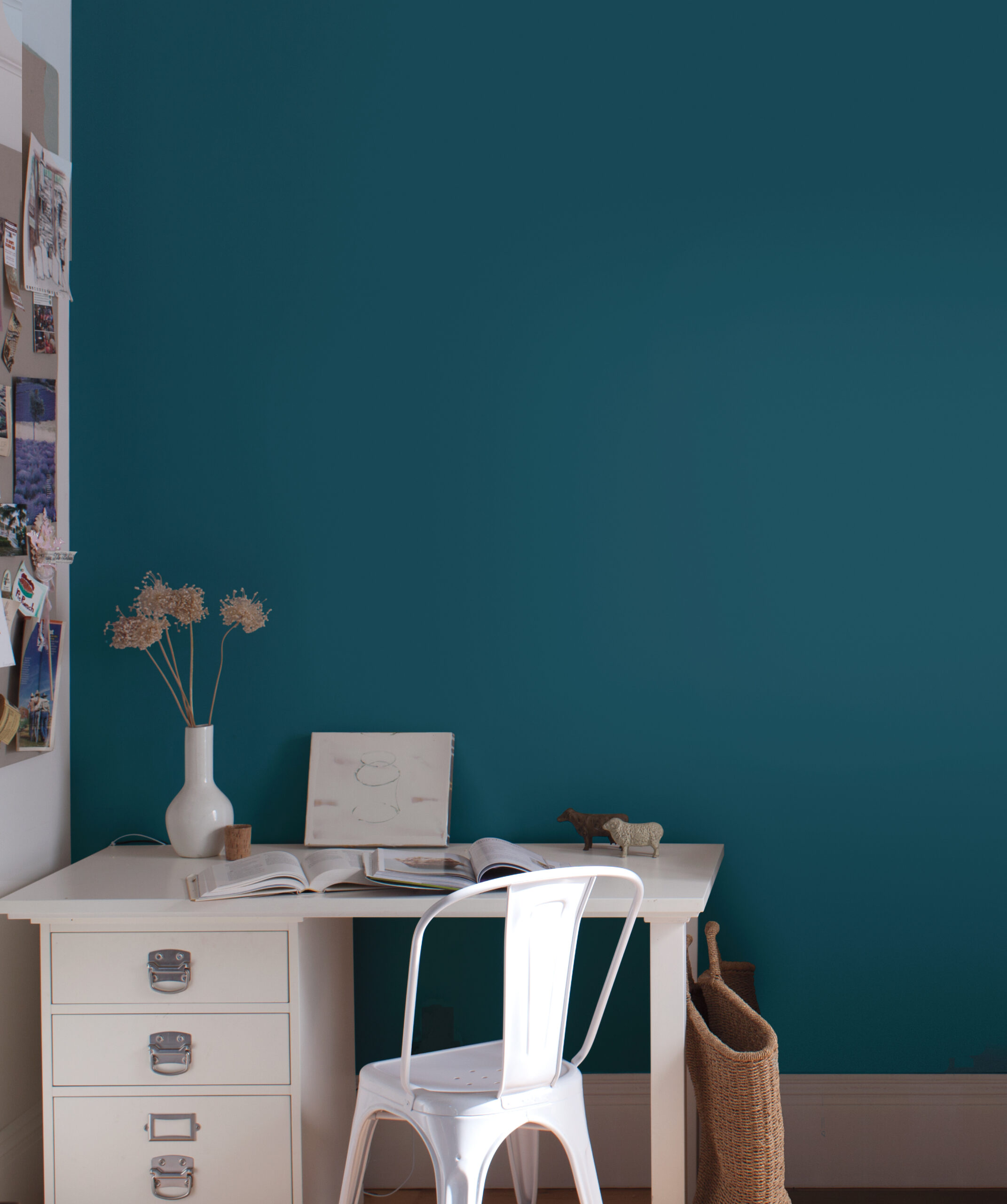Wieczór to oczywiście królestwo odcienia Shadow 2117-30. Równie dzielnie wtórują mu niezwykłe czernie, np. mieniący się szmaragdowo Salamander 2050-10 lub klasyczny brąz Grandfather Clock Brown 2096-30. Całą paletę rozświetlają złamane biele ze wzornika off-white.