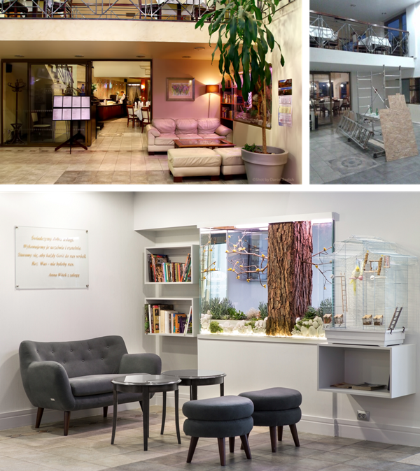 Projektantki firmy Witek- Anna i Zuzanna Pyrkosz, zaangażowane do tego remontu- opowiadają, że aranżując wnętrze lobby i recepcji zależało im na biznesowym wizerunku, prostocie i ponadczasowości: "Przy doborze farb i ich odcieni inspiracje czerpałyśmy ze skandynawskiego stylu, gdzie proste, minimalistyczne wnętrza z oszczędną paletą barw wzbogacone są o chłodne pastele - zgaszone szarości i turkusy. Nowe, idealnie dobrane odcienie farb swą świeżością i głębią tchnęły w dekoracje nowe życie".