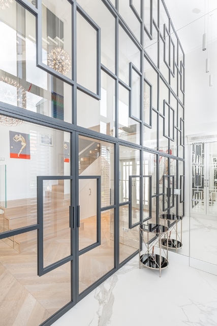 Jeżeli miałabym wskazać element, który zrobił na mnie największe wrażenie w całym tym wnętrzu, to z pewnością będzie to efektowna przegroda stalowo-szklana, która oddziela wiatrołap od pozostałej części holu wejściowego.