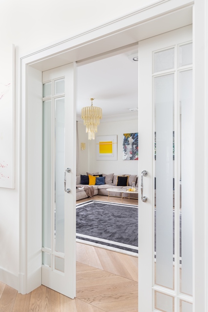Otóż każde z wnętrz dolnej kondygnacji jest niezależnym pomieszczeniem, jednak dzięki podwójnym przesuwnym drzwiom, pomiędzy nimi, w każdej chwili można je ze sobą łączyć lub oddzielać w zależności od potrzeb.