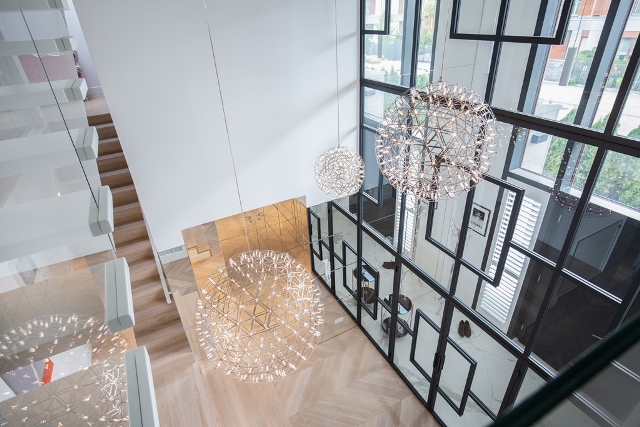 Cała klatka schodowa, podobnie jak reszta wnętrz, pomalowana została farbą marki Benjamin Moore w specyficznym odcieniu bieli - kolorze „Super White”. W ten sposób stworzono neutralne tło dla wielu elementów architektury wnętrza, które miały grać pierwsze skrzypce.