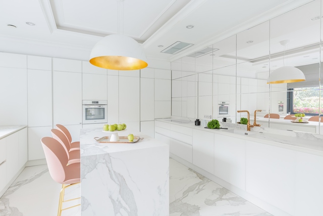 Kuchnia to najbardziej minimalistyczne wnętrze w całym domu. Zabudowa włoskiego producenta Scavolini odbija się w lustrzanych panelach, przez co cała przestrzeń wydaje się jeszcze większa, niż jest w rzeczywistości.