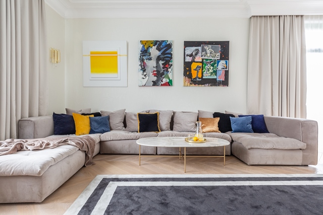 Jako bazę kolorystyczną dla wszystkich wnętrz rezydencji wybrano barwy monochromatyczne – biele, szarości i beże. Przełamano je jednak kolorowymi akcentami – głównie odcieniami pudrowego różu czy błękitu. Nie zabrakło bardziej zdecydowanych detali w odcieniach nasyconego granatu, żółcieni, czerwieni czy złota.