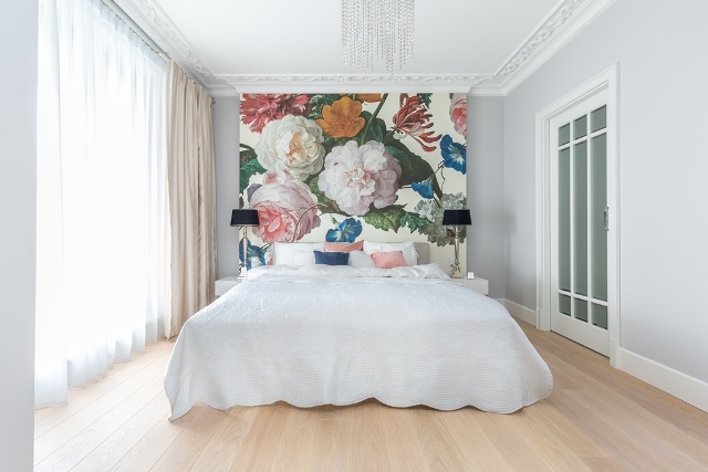 Głównej sypialni nadano typowo kobiecy styl. Dekoracyjna, kwiecista tapeta w żywych kolorach doskonale koresponduje z ornamentalną sztukaterią na suficie.