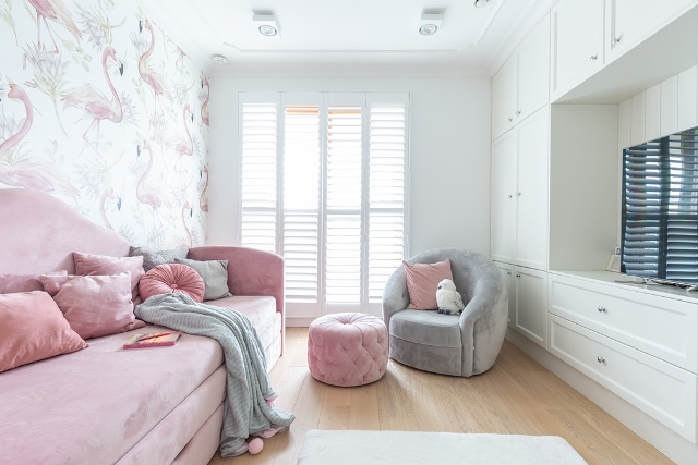 Pokój córki kontynuuje neutralną kolorystykę bieli i szarości. Została ona ożywiona tkaninami i tapetami w odcieniu bladego różu. Dziecięcy charakter wnętrza stworzyła tapeta we flamingi.